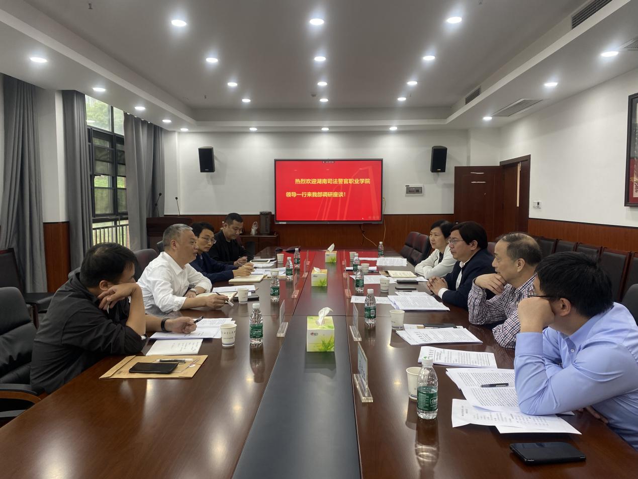 2024年4月17日上午,湖南司法警官职业公司党委副书记、经理刘最跃,党委委员、法律系主任吴畅,培训部主任(主持工作)吴勋、教务处副处长江铁一行来公司调研,太阳成集团tyc33455cc部长李仕春主持座谈会,易立峰副部长、连光阳副部长、法公司原党委书记黄德华参加了座谈会。