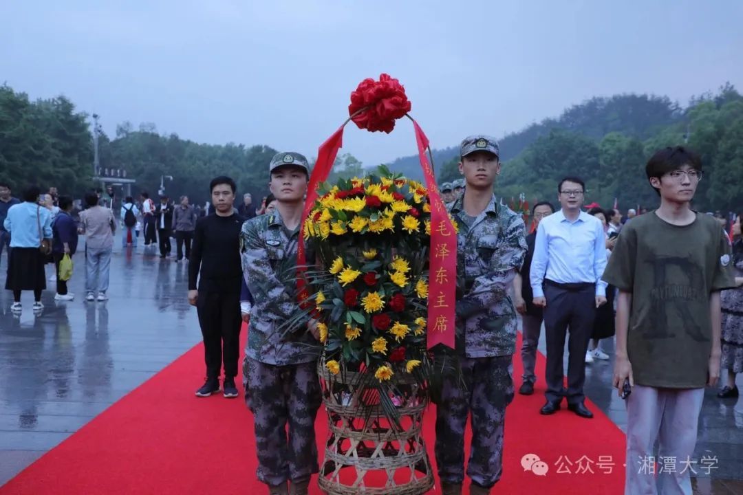 28日清晨6点,夜幕褪去,日出东方,徒步韶山行全体参加者顺利到达韶山毛泽东铜像广场,师生代表向毛泽东主席铜像敬献花篮,鞠躬瞻仰。