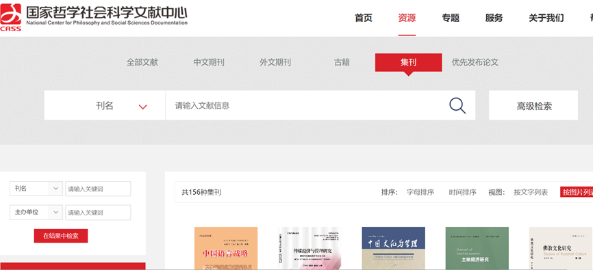 登录“国家哲学社会科学文献中心”数据库首页,切换至左上角“资源”,并在全部文献种类中选择“集刊”。