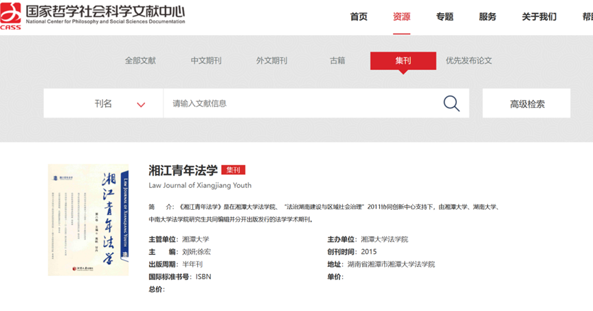 “国家哲学社会科学文献中心”数据库现有中文期刊、外文期刊、古籍、集刊等资源,收录哲学社会科学相关领域文献超过2000万条,提供有线阅读、全文下载等服务,内容丰富、功能全面。那么如何在“国家哲学社会科学文献中心”数据库找到新合作的《湘江青年法学》呢?