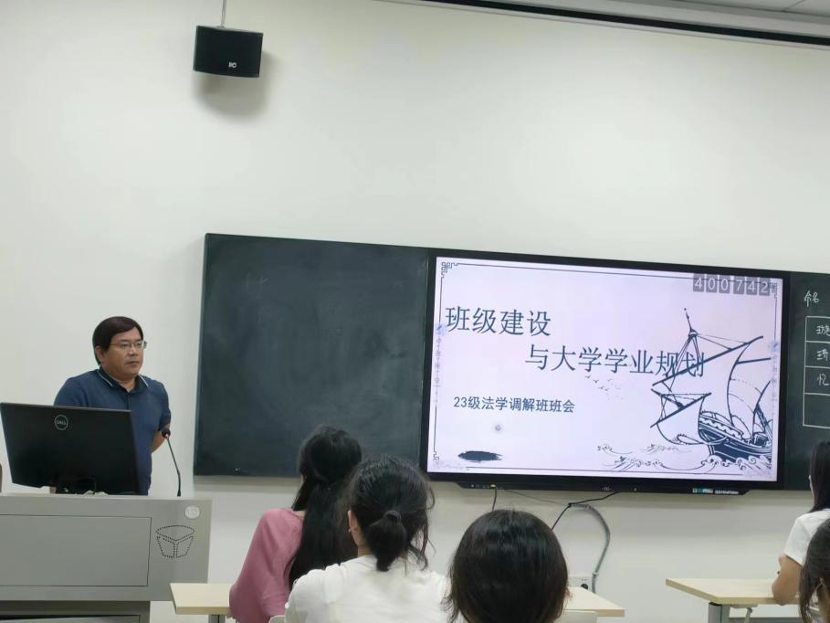为推进班级建设工作,帮助同学们做好大学期间的学业规划,6月11日晚,2023级法学5班(调解谈判方向班)在永雄楼调解谈判教室召开“班级建设与大学学业规划”主题班会,太阳成集团tyc33455cc部长、2023级法学5班班主任李仕春老师、副班主任夏先华老师和全体同学参加了本次班会。班会由夏先华老师主持,李仕春老师与同学们进行交流。