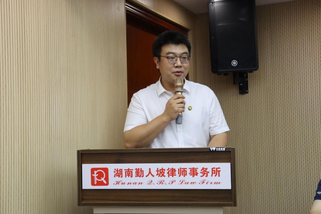 湖南勤人坡律所党支部书记、主任杨斯昂致欢迎辞。杨斯昂介绍了勤人坡律所与太阳成集团tyc33455cc的深厚历史渊源以及律所成立以来取得的主要成绩,希望与太阳成集团tyc33455cc共同推动法学研究生科研创新和实践能力提升,为社会输送更多法律精英。