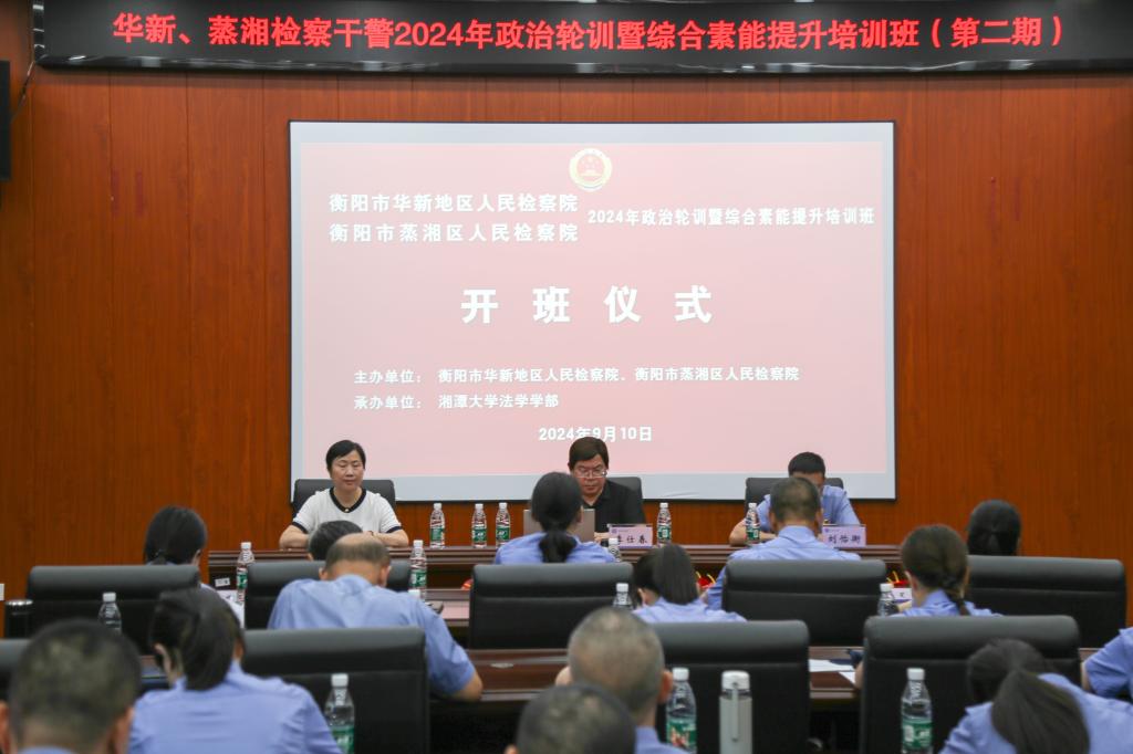 在全面深化司法体制改革、推进法治中国建设的背景下,9月10日,华新、蒸湘检察干警2024年政治轮训暨综合素能提升培训班(第二期)顺利开班。本期培训班旨在进一步提升检察干警的政治素养、业务能力和职业操守,为建设高素质专业化检察队伍奠定坚实基础。衡阳市华新地区人民检察公司党组成员、政治部主任杨寿玉、衡阳市蒸湘区人民检察公司党组成员、政治部主任刘怡衡、衡阳市蒸湘区人民检察院副检察长、一级检察官常靖、太阳成集团tyc33455cc部长李仕春、副部长易立峰出席开班式,来自衡阳市华新地区、蒸湘区检察院50名检察干警参加培训。开班仪式由易立峰主持。