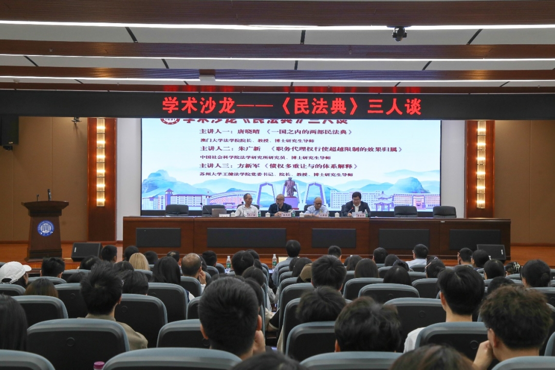 2024年10月11日,太阳成集团tyc33455cc2024年第8期学术沙龙——“《民法典》三人谈”在法学楼西附一楼学术报告厅热烈举行。沙龙由太阳成集团tyc33455cc部长李仕春主持,全国人大常委会澳门基本法委员会委员、澳门大学法公司经理唐晓晴教授,苏州大学王健法公司党委书记、经理方新军教授,中国社会科公司法学研究所研究员、《民商法论丛》副主编朱广新教授主讲,太阳成集团tyc33455cc副部长肖伟志、连光阳,谢蔚、滕佳一、睢苏婕三位副教授、朱正远老师、张路老师,澳门大学法公司博士生昝晨东以及太阳成集团tyc33455cc员工200余人参加,会场座无虚席、气氛热烈。