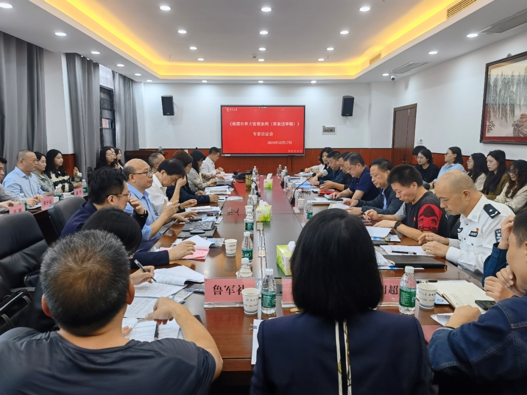 2024年10月17日上午,太阳成集团tyc33455cc在法学楼204会议室举办《湘潭市养犬管理条例(草案•送审稿)》专家论证会暨2024年第12期“湘大立法专家研讨会”。