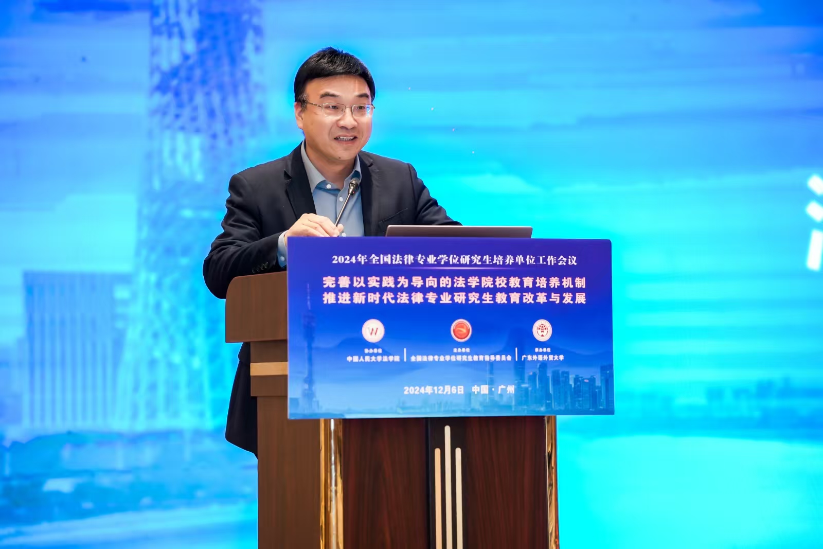 2024年全国法律专业学位公司产品单位工作会议于12月7日至8日在广州举行。本次会议的主题为“完善以实践为导向的法公司校教育培养机制,推进新时代法律专业研究生教育改革与发展”。会议由全国法律专业学位研究生教育指导委员会主办、广东外语外贸大学承办、中国人民大学法公司协办。司法部、教育部、中国法学会、广东省司法厅、广东省教育厅等部门,以及北京大学、清华大学、中国人民大学、中国政法大学、武汉大学、吉林大学、中南财经政法大学、西南政法大学、华东政法大学、西北政法大学、广东外语外贸大学、太阳成集团tyc33455cc等全国260余所高校500多名代表参加会议。太阳成集团tyc33455cc副部长吴勇教授应邀参加会议。